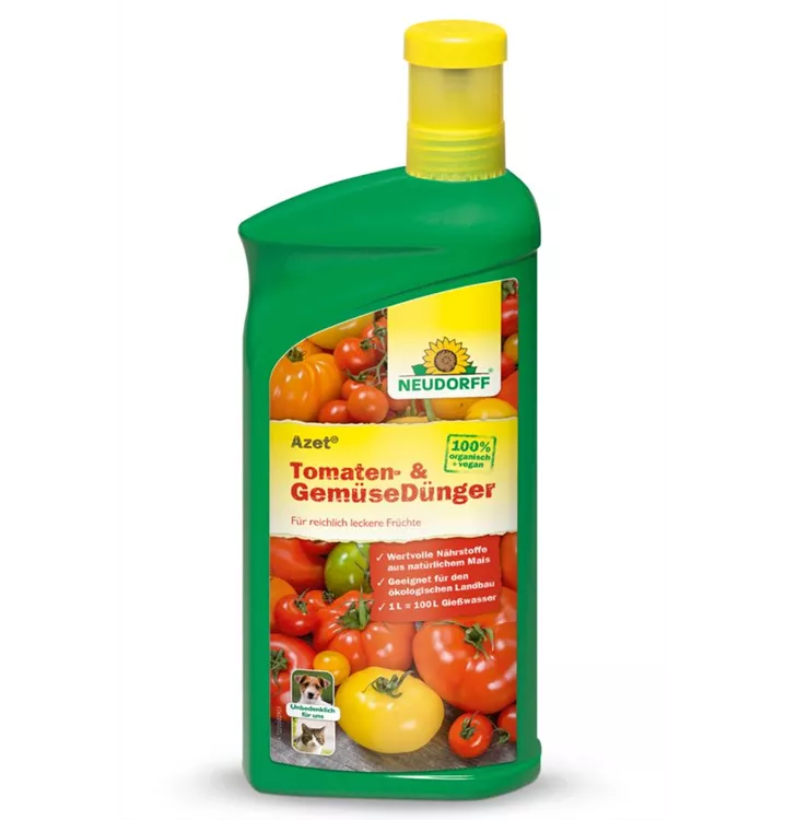 Azet Tomaten- und GemüseDünger liefert viel natürliches Kalium für mehr Geschmack und eine reiche Ernte. Der Flüssigdünger hat einen NPK-Wert von 3-3-3 und ist optimal für alle Tomatenpflanzen geeignet. Verwenden Sie Azet Tomaten- und GemüseDünger auch für Paprika, Gurken und Zucchini. Die enthaltenen BIOlogischen Stoffe sorgen für kräftige und gesunde Wurzeln. Wasser und Nährstoffe werden besser und schneller aufgenommen. Das führt zu besonders aromatischen Früchten, einem beschleunigten Pflanzenwachstum und erhöhter Widerstandskraft gegen Kälte, Frost, Trockenheit und andere Stressfaktoren.