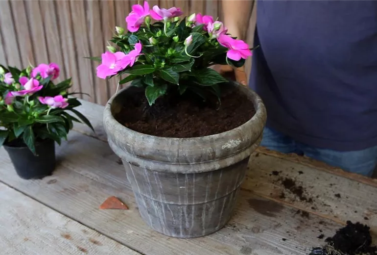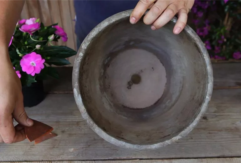 Bevor Sie handelsübliche Blumenerde in den Topf füllen, sollten Sie das Loch aber leicht bedecken: Zum Beispiel mit einer Tonscherbe. Diese verhindert, dass das Abzugsloch verstopft.