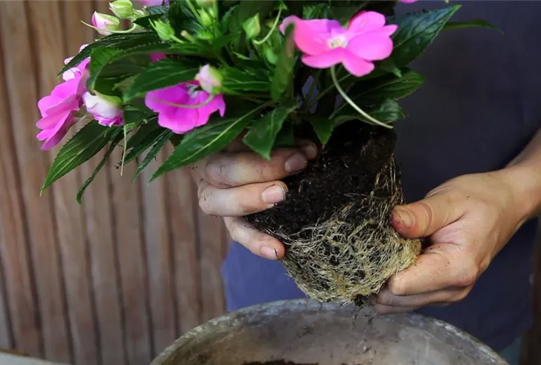 Durch das Auflockern des Wurzelballens und das Entfernen von alter Erde, erleichtern Sie der Pflanze zusätzlich das schnelle Einwurzeln.