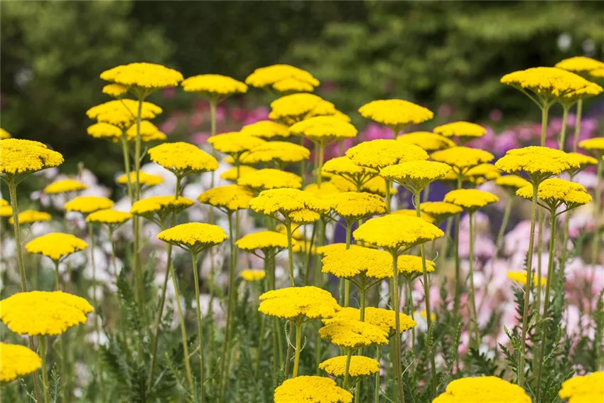 Wer es fulminant mag, kombiniert einen gloriosen silberfarbenen Blickfang, wie eine Silber- oder eine Elfenbeindistel, mit einem Goldrausch an Blütenzauber. Das kann zum Beispiel Sonnenhut oder Goldgarbe sein. Jede Blüte, die im gelben Bereich des Regenbogens liegt, unterstreicht den Goldglanz-Effekt. Hier dürfen durchaus Pflanzen wie Kamille und Frauenmantel zum Zuge kommen, die ansonsten gut in einen Bauerngarten passen. Auf die glamouröse Kombination kommt es eben an! Wer die Farben der beiden Edelmetalle Gold und Silber mutig in einen Dialog bringt, erzeugt eine große Energiequelle. An diesem Beet bleibt jeder stehen.